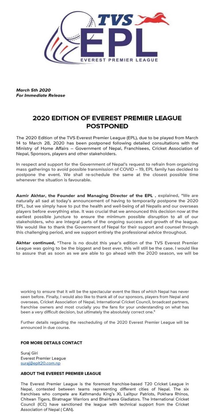 कोभिड–१९ को सम्भावित संक्रमणको रोकथामका लागि भन्दै सरकारले ठूलो संख्यामा मानिस जम्मा हुने सभा सम्मेलन तथा खेल प्रतियोगिताहरु स्थगित गर्न निर्देशन दिइसकेको छ । प्रतियोगिता स्थगित गर्नुपर्दा दुःख लागे पनि सम्पूर्ण नेपाली नागरिक तथा विदेशी खेलाडीको स्वास्थ्य नै ठूलो कुरा भएकाले प्रतियोगिता स्थगित गरिएको अईपीएलका संस्थापक तथा प्रबन्ध निर्देशक अमिर अख्तरले जानकारी दिए । कोभिड–१९ को संक्रमणको अवस्था हेरेर प्रतियोगिताको नयाँ तालिकाबारे जानकारी दिइने समेत उनले बताए ।