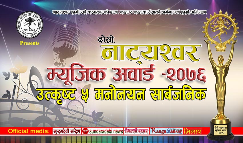 रङ्गमञ्च । ‘नाट्यश्वर म्यूजिक अवार्ड २०७६ का लागि विविध ४८ विधामा उत्कृष्ट पाँचको मनोनयन सार्वजनिक गरिएको छ । आयोजकले प्रेस विज्ञाप्ति जारी गर्दै मनोनयन सार्वजनिक गरेको हो । अवार्डको दोस्रो संस्करणमा तामाङ सेलो लगायत समूदाय विदेश गीत/संगीतदेखि मौलिक गीत, लोकदोहोरी, आधुनिक, पप तथा राष्ट्रिय भाव विधालाई समेटिएको विज्ञाप्तिमा उल्लेख छ । गत वर्षदेखि मोफसलका जिल्लाहरुमा आयोजना हुने उद्देश्यसहित आयोजना हुँदै आएको अवार्डको यस वर्ष नुवाकोटमा हुने जनाइएको छ। यद्दपी विश्वव्यापी रुपमा फैंलिएको कोरोना भाइरसको कारण अवार्डको मिति निश्चित नभइसकेको सदस्य सचिव दिनेश शिवाकोटीले जानकारी दिएका छन्। अवार्डमा नेपाली संगीत क्षेत्रमा लामो समय योगदान पुर्याएका हस्ती, एक रंगपत्रकारलाई समेत पुरस्कृत गरिने नाट्यश्वर म्यूजिक अवार्डका अध्यक्ष प्रल्हाद केसीले जानकारी दिएका छन् ।