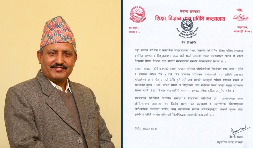 देश । पछिल्लो समय कोरोना भाइरसको त्रास विश्वमा फालिएको छ । विश्व स्वास्थ्य संगठनले यसलाई महामारी घोषणा गरिसेको छ । विश्वको टाउको दुखाइ बनेको कोरोना भाइरसलाई लिएर नेपाल सरकारले पनि सावधानीका उपाए अपनाएका छन् । अनावश्यक रुपमा भिडभाडमा नजान नेपाल सरकारले अनुरोध गरिरेहेको छ । यद्दपी मल , विधालय , फिल्म हल भने खुल्लै छन् । यसैगरी बिविबार देखि सुरु हुने माध्यमिक शिक्षा परीक्षा (एसईई) नरोकिने भएको छ । शिक्षा, विज्ञान तथा प्रविधिमन्त्री गिरिराजमणि पोखरेलले सोमबार अपील जारी गर्दै परीक्षा सञ्चालनको सबै तयारी पूरा भएको बताएका छन् । ६ देखि १७ चैतसम्म हुने परीक्षामा देशभरका कुल ४ लाख ८२ हजार २१९ परीक्षार्थी सहभागी हुनेछन् र, १ हजार ९९५ परीक्षा केन्द्र तोकिएको छ ।