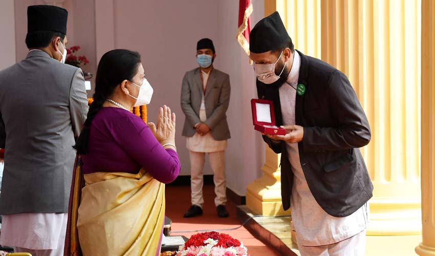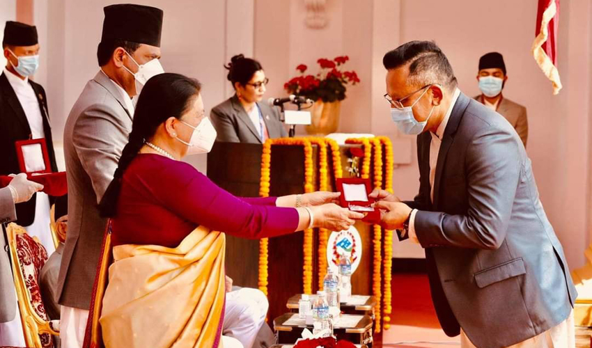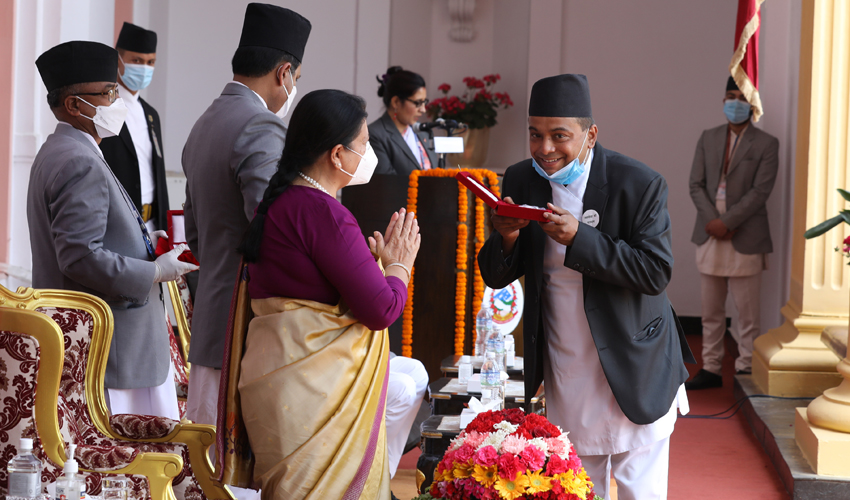 फिल्म । राष्ट्रपति विद्यादेवी भण्डारीले राष्ट्रका विभिन्न क्षेत्रमा योगदान पुर्याएका व्यक्तिलाई शीतल निवासमा आयोजित समारोहमा विभिन्न मानपदवी, अलङ्कार र पदकबाट सुशोभन गरेकी छिन् । राष्ट्रपतिले शीतलनिवासमा एक समारोहको आयोजना गर्दै २०७६ सालमा घोषित विभूषण प्राप्त गर्ने निर्देशक दिनेश डीसी र अभिनेता निखिल उप्रेतीलाई प्रबल जनसेवा श्री पदकद्वारा सम्मान गरियो ।