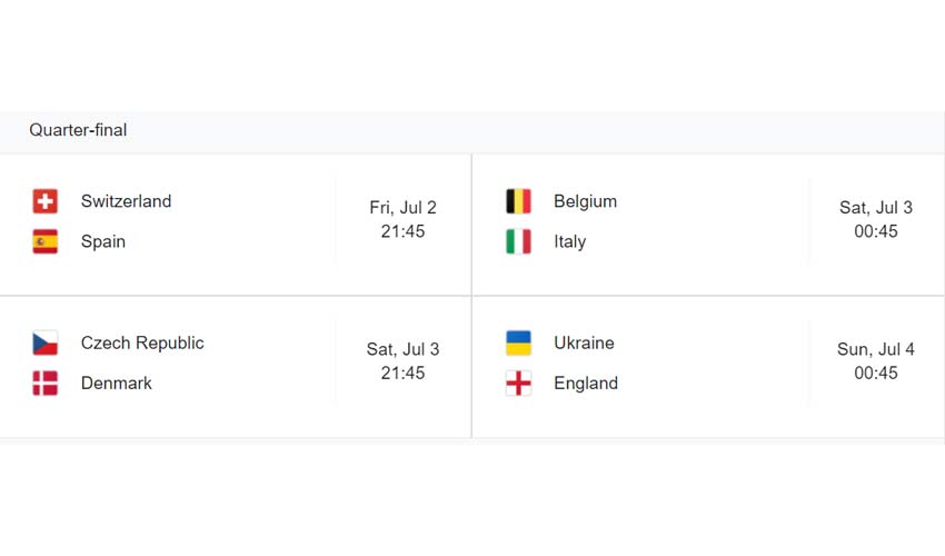 क्वार्टरफाइनलमा स्विट्जरल्यान्ड भर्सेस स्पेनको खेल शुक्रबार राति ९:४५ बजे , बेल्जियम भर्सेस इटालीको खेल शुक्रबार राति १२:४५ बजे , चेक गणतन्त्र भर्सेस डेनमार्कको खेल शनिबार राति ९:४५ बजे र युक्रेन भर्सेस इंग्ल्यान्डको खेल शनिबार राति १२:४५ बजे हुनेछ ।