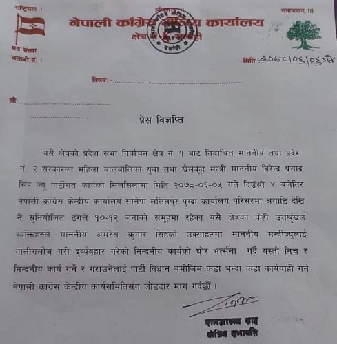 यस्तै , सर्लाही क्षेत्र नम्बर ४ का क्षेत्रीय सभापति राम आश्रय शाहले प्रेस विज्ञाप्ति जारी गर्दै घटना नियोजित रुपमा भएको भन्दै दोषीलाई कारवाहीको मांग गरेका छन् । ‘माननीय अमरेश सिंहको उक्साहटमा मन्त्री विरेन्द्र सिंह माथि दुर्व्यवहारको दोषीलाई कडा भन्दा कारवाही विधान बमोजिम गर्न केन्द्रीय समिति समक्ष माँग गर्दछु’ क्षेत्रीय सभापति शाहद्वारा जारी गरिएको विज्ञाप्तिमा उल्लेख छ ।