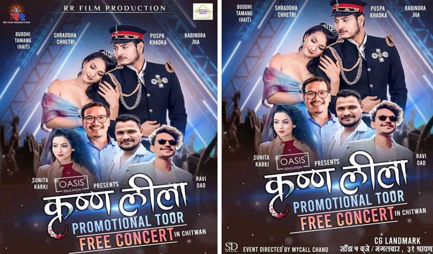 ओएसीस एजुकेशन (अष्ट्रेलीयन भिसा स्पेशलिष्ट) को प्रस्तुति तथा माइकल चन्दको इभेन्ट निर्देशन रहेको प्रमोशन टुरको कन्सर्टमा ‘कृष्ण लीला’ का ‘कृष्ण’ अर्थात् अभिनेता पुष्प खड्का, ‘लीला’ अर्थात अभिनेत्री श्रद्धा क्षेत्री,‘पासाङ’ अर्थात् बुद्धि तामाङ, ‘राम भरोस’ अर्थात् रबिन्द्र झाका साथमा यसै फिल्मको सुपरहिट गीत ‘ए मेरो हजुर..’ का गायक रबि ओड र गायिका सुनीता कार्की,कोरियोग्राफर माइकल चन्दले चितवनवासीलाई झुमाउने छ ।