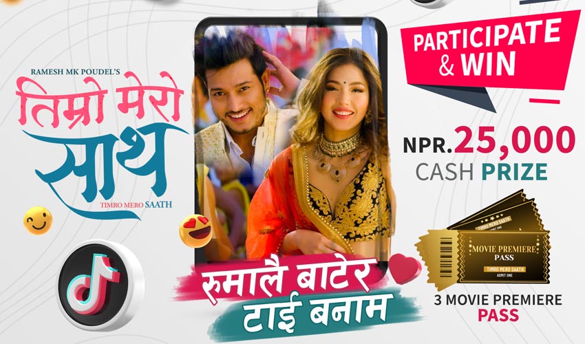 फिल्म । टिकटक बनाउँदा पुरस्कार पाइने भएको छ । रमाइलोको लागि बनाइने टिकटककै लागि फिल्म ‘तिम्रो मेरो साथ्’ युनिटले विभिन्न शर्त राख्दै पुरस्कार दिने घोषणा गरेको छ । आउँदो पुष २९ गतेबाट प्रदर्शनमा आउने फिल्मले नगदराशि सहित टिकटक प्रतियोगिता घोषणा गरेको छ । फिल्मको सार्वजनिक पहिलो गीत ‘रुमालै बाटेर टाई बनाम’मा टिकटक भिडियो निर्माण गरेर तीन हयास ट्याग #rumalaibatera, #timromerosath, #RameshMKPoudel प्रयोग गरेर भिडियो अपलोड गर्नुपर्ने हुन्छ । यसमा विजयी सहभागीले नगद रू.पच्चीस हजार र प्रिमियरको तीन वटा टिकेट प्राप्त गर्नेछन् ।