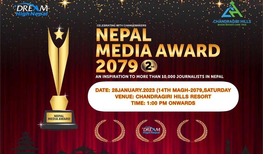 देश । सञ्चारकर्मीहरुलाई सम्मान र प्रोत्साहन गर्ने उद्देश्यसहित ‘दोस्रो नेपाल मिडिया अवार्ड २०७९’ आयोजना हुने भएको छ । आउँदो माघ १४ गते चन्द्रागिरी हिल्स रिसोर्टमा ड्रिम हाइ नेपाल प्रालिले अवार्ड समारोह आयोजना गर्न लागेको जानकारी दिएको छ । अवार्ड समारोहमा नेपाल सरकारका विशिष्ट व्यक्ति र दुई सय बढि पत्रकारको उपस्थिती रहने आयोजकले जनाएको छ ।
