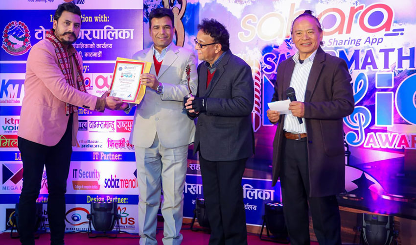 संगीत । सगरमाथा म्युजिक अवार्डको चौथो संस्करण सम्पन्न भएको छ। ‘नेपाली कला र श्रष्ठाको सम्मान, नेपाली संस्कृति संरक्षण प्रवर्द्धन हाम्रो अभियान’ भन्ने नाराको साथ भएको अवार्ड अर्थ नेपाल प्रालिको आयोजनामा भएको हो । अवार्डमा विशिष्ट गीतकार श्रीपुरुष ढकाललाई सगरमाथा लाइफटाइम अचिभमेन्ट अवार्डमा नगद रु.१७ हजार ६ सय ९६ सहित सम्मान गरिएको थियो । सम्मान प्रमुख अतिथि टोखा नगरपालिकाका प्रमुख प्रकाश अधिकारी, ज्योती विकास बैंकका एजिएम रामहरी आचार्य, कार्यक्रम प्रमुख पुरुषोत्तम बस्नेत, कार्यक्रम संयोजक मनोज थापाले प्रदान गरेका थिए ।
