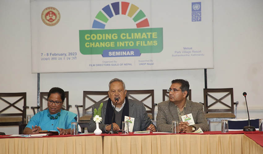 फिल्म। चलचित्र निर्देशक समाजले युएनडीपीसँगको सहकार्यमा ‘कोडिङ क्लाइमेट चेन्ज इन्टु फिल्मस्’ शीर्षकको दुई दिने सेमिनार सम्पन्न गरेको छ। सञ्चार तथा सूचना प्रविधि मन्त्री रेखा शर्माले उद्घाटन गर्नुभएको सेमिनारमा पहिलो दिन जलवायु परिवर्तन र यसका असरका सम्बन्धमा र दोस्रो दिन जलवायु परिवर्तनको मुद्दालाई कथामा जोड्ने विषयमा छलफल भएको थियो।