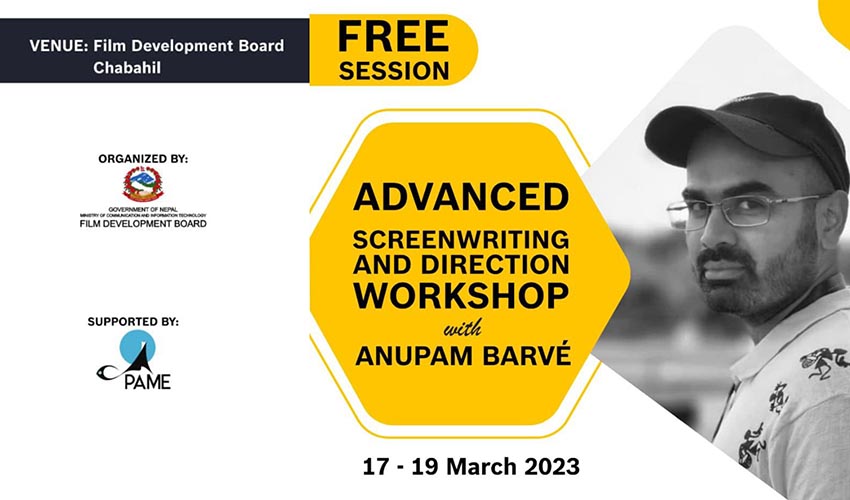 फिल्म। चलचित्र विकास बोर्डले पटकथा लेखन र निर्देशन बिषयमा तीन दिने बिशेष कार्यशाला आयोजना गर्ने भएको छ । भारतीय फिल्ममेकर तथा पूर्व एफटीआईआई (फिल्म एण्ड टेलिभिजन इन्स्टिच्युट अफ इन्डिया, पुणे)का एसोसिएट प्रोफेसर अनुपम बर्वेको साथमा आगामी चैत्र ३ देखि ५ गतेसम्म कार्यशाला आयोजना हुन लागेको हो ।बोर्डको हलमा हुने कार्यशाला दैनिक बिहान १०:३० बजेदेखि दिउसो ३:३० बजेसम्म सञ्चालन हुनेछ । कार्यशालामा सहभागिता जनाउन बोर्डको वेबसाइट तथा सोसल प्रोफाईलमा रहेको फारम भर्नुपर्ने हुन्छ ।