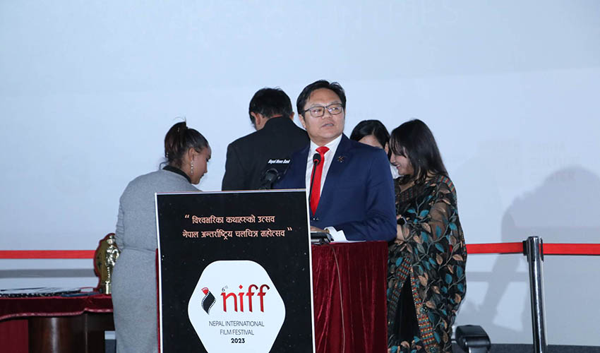 फिल्म। गत चैत २ गतेदेखि काठमाडौंमा जारी रहेको नेपाल अन्तर्राष्ट्रिय चलचित्र महोत्सव (निफ) को छैठौँ संस्करण सम्पन्न भएको छ। समापन समारोहलाई सम्बोधन गर्दै संस्कृति, पर्यटन तथा नागरिक उड्डयनमन्त्री सुदन किराँतीले पर्यटन विकासका लागि फिल्मको योगदान महत्वपूर्ण हुने बताए । ‘फिल्ममार्फत हामीले पर्यटनमा टेवा पुर्याउन सक्छौँ। फिल्मकर्मीलाई हामी सहयोग गर्छौं। तपाइँहरूले पनि सोच बनाउनुस्’, मन्त्री किरातीले भन्नुभयो,’फिल्मलाई नरम कुटनीतिको रुपमा बुझेको छ। यसले सांस्कृतिक, भौगोलिक, भाषिक लगायतको प्रभाव सहजै पार्न सक्छ।’।