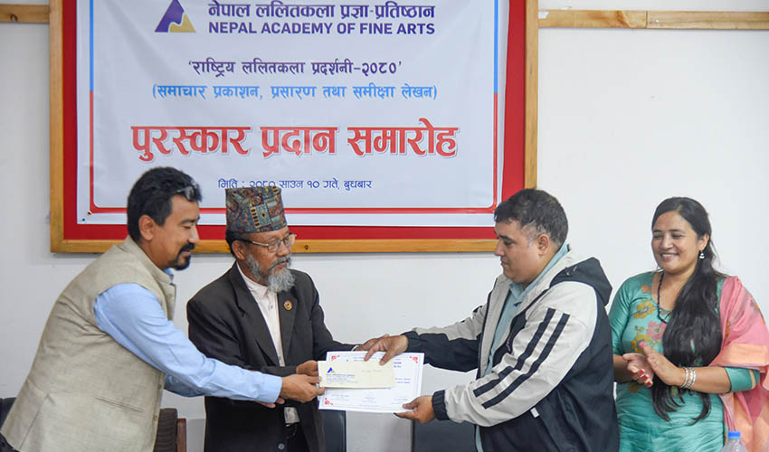 देश । नेपाल ललितकला प्रज्ञा प्रतिष्ठानको आयोजनामा सम्पन्न ‘राष्ट्रिय ललितकला प्रदर्शनी–२०८०’ का बारेमा समाचार लेखन, प्रसारण तथा समीक्षा लेखन प्रतियोगितामा उत्कृष्टहरुलाई बुधबार पुरस्कृत गरिएको छ । परस्कृत हुनेहरुमा समाचार लेखन तथा प्रसारण प्रतियोगितामा सुकृत नेपाल (गोरखापत्र दैनिक), रेनुका ढकाल (दी राइजिङ नेपाल), उर्जा आचार्य (दि काठमाडौं पोस्ट), दीपेन्द्र ढुंगाना (नयाँ पत्रिका), हेमन्त गौतम (एनटिभी प्लस) पुरस्कृत भएका हुन । प्रतियोगितामा दियालक्ष्मी जोशी (एमएफए, काठमाडौं विश्वविद्यालय), प्रतिभा खड्का (बिएफए, ललितकला क्याम्पस, प्रतिभा तिवारी (बिएफए, ललितकला क्याम्पस) पुरस्कृत भएका छन् ।