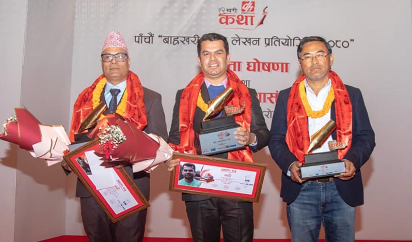 कथा प्रतियोगिताको पाँचौं संस्करणका उत्कृष्ट कथाकारहरूलाई पूर्व प्रधान न्यायाधीश श्रेष्ठसँगै डिश मिडिया लिमिटेडका प्रमुख कार्यकारी अधिकृत सुदीप आचार्य, नेपाल इन्भेष्टमेन्ट मेगा बैंकका प्रमुख कार्यकारी अधिकृत ज्योति पाण्डे, राष्ट्रिय वाणिज्य बैंकका प्रमुख कार्यकारी अधिकृत किरण श्रेष्ठ, नेपाल आयल निगमका निमित्त कार्यकारी निर्देशक नागेन्द्र साहसहित बाह्रखरी मिडियाका प्रधानसम्पादक प्रतीक प्रधान, प्रबन्ध निर्देशक ज्ञानेश्वर आचार्य, प्रबन्ध सम्पादक राजेश केसी, विशेष सम्पादक हरिबहादुर थापा, विचार सम्पादक तथा आन्तरिक निर्णायक समूहका संयोजक गोविन्द अधिकारीलगायतले खादा, प्रमाणपत्र, नगद र ट्रफी प्रदान गरे ।