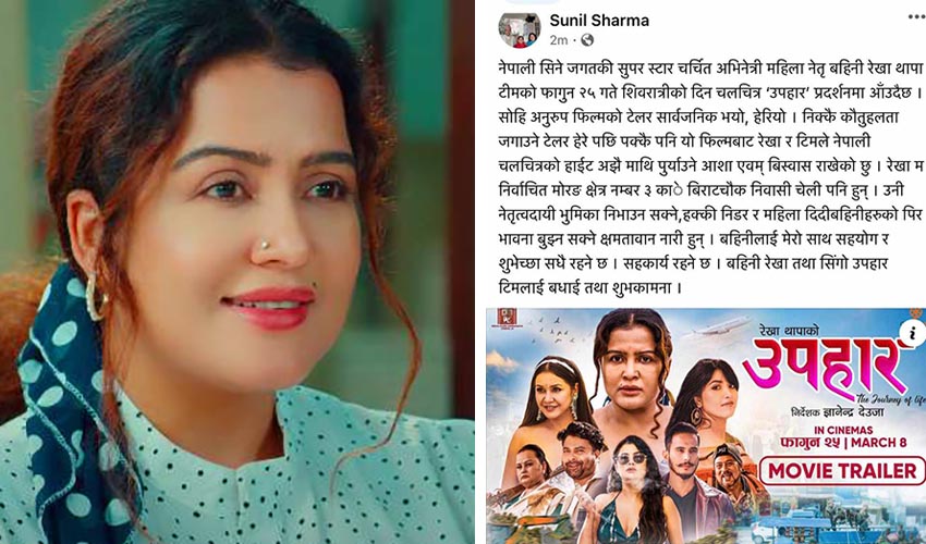 ‘नेपाली सिनेजगतकी सुपरस्टार चर्चित अभिनेत्री महिला नेतृ बहिनी रेखा थापा टिमको फागुन २५ गते शिवरात्रीको दिन चलचित्र ‘उपहार’ प्रदर्शनमा आँउदैछ । सोहि अनुरुप फिल्मको ट्रेलर सार्वजनिक भयो, हेरियो । निक्कै कौतुहलता जगाउने ट्रेलर हेरे पछि पक्कै पनि यो फिल्मबाट रेखा र टिमले नेपाली चलचित्रको हाईट अझै माथि पुर्याउने आशा एवम् विस्वास राखेको छु’, उनले लेखेका छन् ।