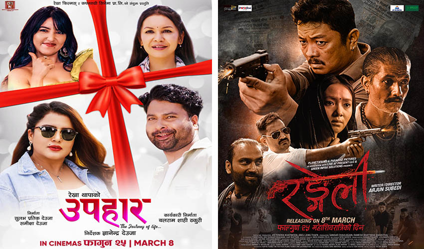 फिल्म । फ्राइडे रिलिज अन्तर्गत एकसाथ तीन फिल्म प्रदर्शन गरिएको छ । ‘उपहार’, ‘काँडेतार’ र ‘रङ्गेली’ महाशिवरात्रीलाई लक्षित गर्दै प्रदर्शन गरिएका फिल्म हुन् । रेखा थापाको निर्माणसँगै अभिनय रहेको ‘उपहार’ मा काठमाडौँमा जीविकोपार्जनको लागि तीन महिलाले गर्ने सङ्घर्षको कथा देखाईएको छ । अभिनेत्री थापाले चिया बेचेर पनि स्वदेशमै पाउन सकिने सफलताको संदेश आफ्नो पात्रले युवालाई दिने बताइन ।