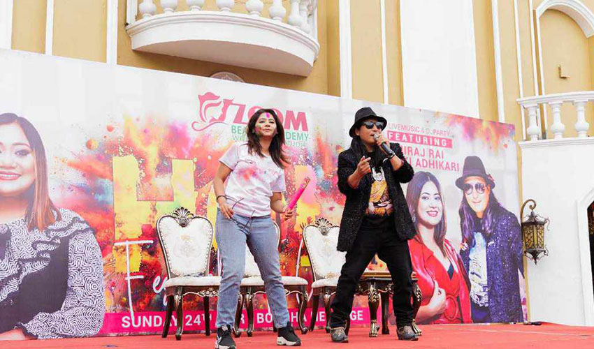 सङ्गीत । जुम ब्यूटी एकेडेमीले काठमाडौँको बौद्धमा आयोजना गरेको होली विशेष कार्यक्रममा गायक धिरज राई र अभिनेत्री केकी अधिकारीले होली खेलेका छन् । उनीहरूले उपस्थित दर्शकलाई आफ्नो कला कौशलताले मनोरन्जन दिलाएका थिए । जाँदै छु टाढा, सोल ढोले सोल, लुकी लुकी, जाउ जाउ समाउ, हिमाल नझुकेसम्म जस्ता गीतहरुमार्फत गायक राईले उपस्थितलाई नचाएका थिए ।
