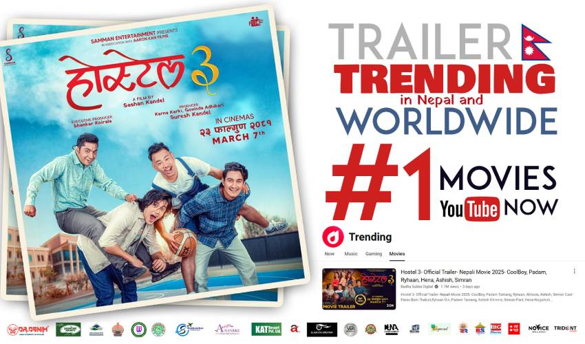 फिल्म । नेपाली फिल्म ‘होस्टेल ३’को गत शुक्रवार सार्वजनिक भएको ट्रेलरले दर्शकको साथ प्राप्त गरेको छ । रिलिजको ६ घण्टामै युट्युबको ट्रेन्डिङ यात्रा सुरु गरेको ट्रेलरले २१ घण्टामा नै १० लाख भ्युज प्राप्त गरेको थियो भने नेपालमा फिल्म सेक्सनमा पहिलो स्थानमा र करिब १५ वटा देशमा ट्रेन्डिङमा आएको थियो, जुन अहिलेसम्म पनि कायमै छ ।